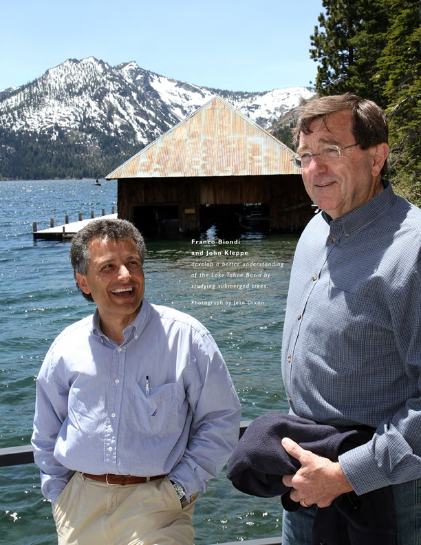 Franco Biondi and John Kleppe develop a better understanding of the Lake Tahoe Basin by studying submerged trees. Photo by Jean Dixon.